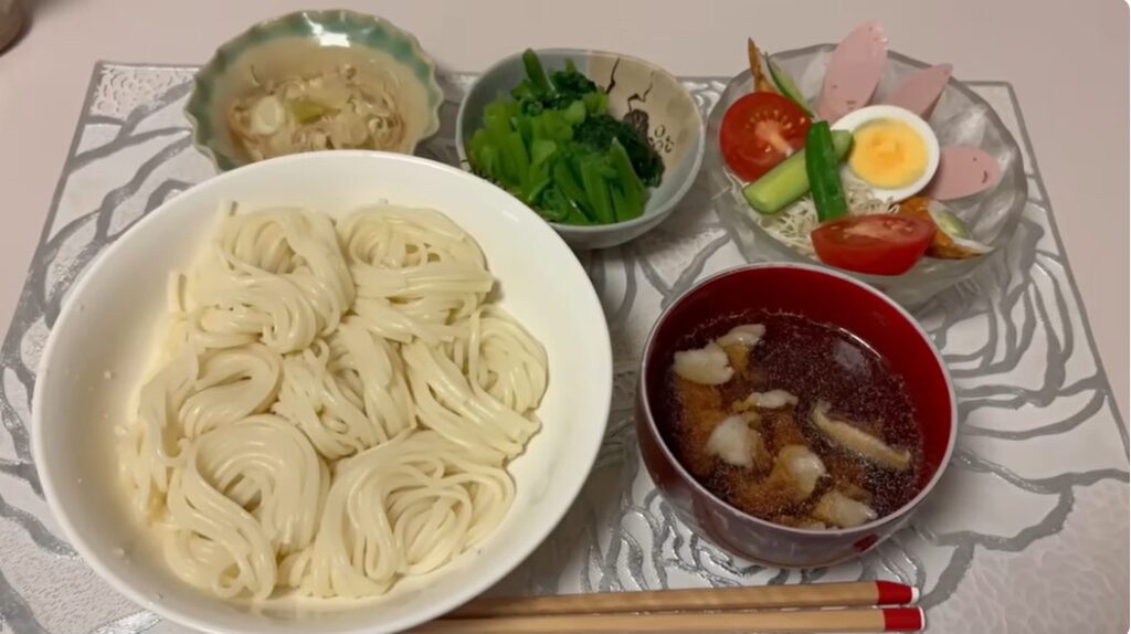 ゆで卵、ちくわきゅうりのサラダ、ミョウガたっぷりのうどんと、バランスのとれた献立が食卓に並びました。