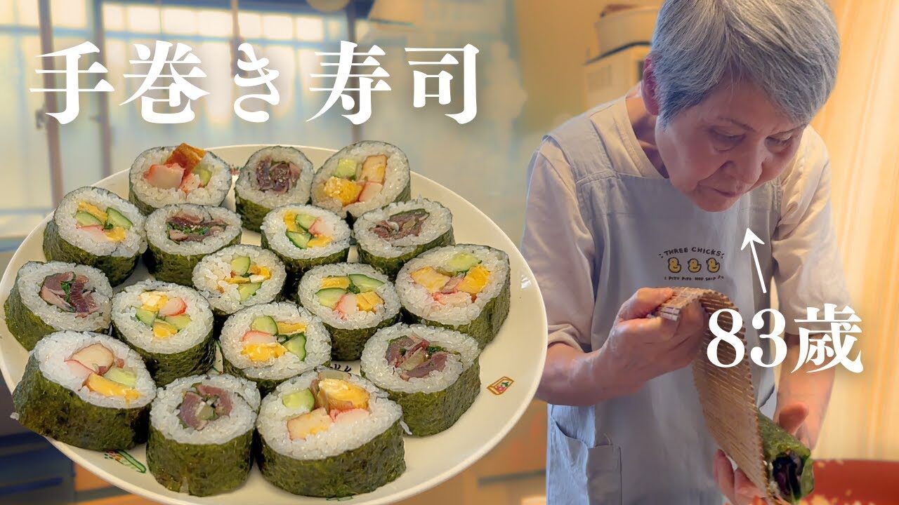カツオの巻き寿司、初めて見ました。ミョウガや大葉を入れるんですね。おばあちゃんはなんでも作れますね。巻くのは結構難しいですけど、さすがは経験豊富なおばあちゃん、手際が良いです。毎日手作りの美味しいご飯食べられて幸せですよ。動画に残してますから、自分でも作れるようになれば良いですね。