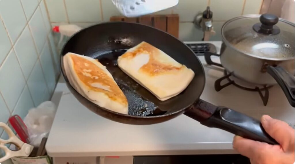 フライパンで火を通したあと、 片栗粉でとろみをつけてから挟んでいました。