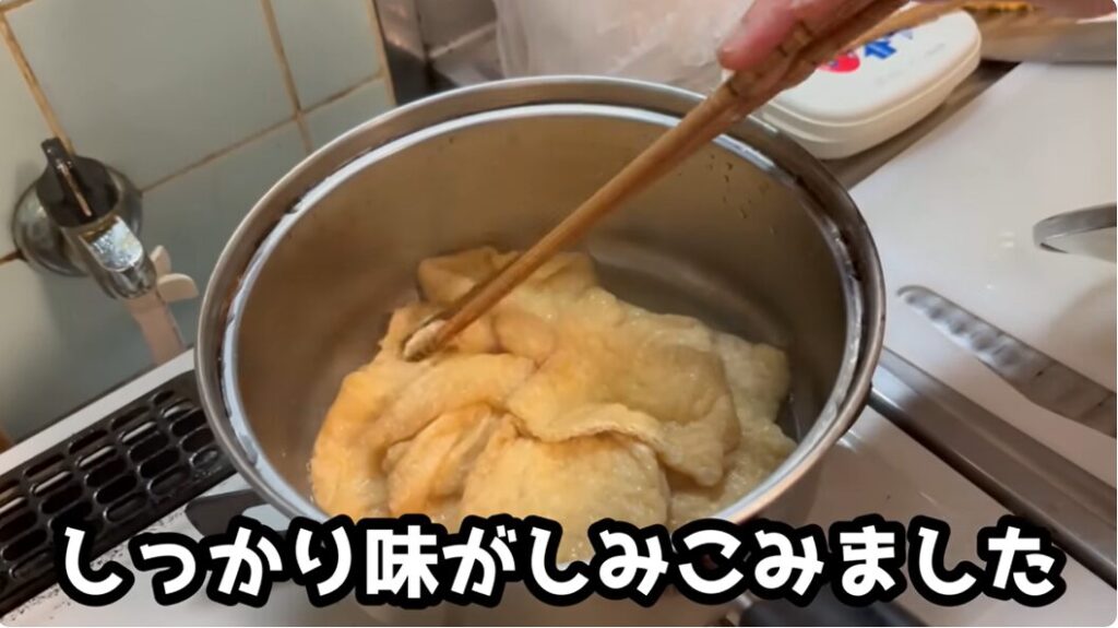 おばあちゃんはまず油揚げを油通しして、 余分な油をしっかり抜いていました。