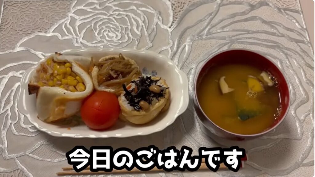 稲荷ずし・はんぺんサンド・かぼちゃとしいたけの味噌汁、 そしてミニトマト——彩りも栄養もたっぷりな一汁一菜です。