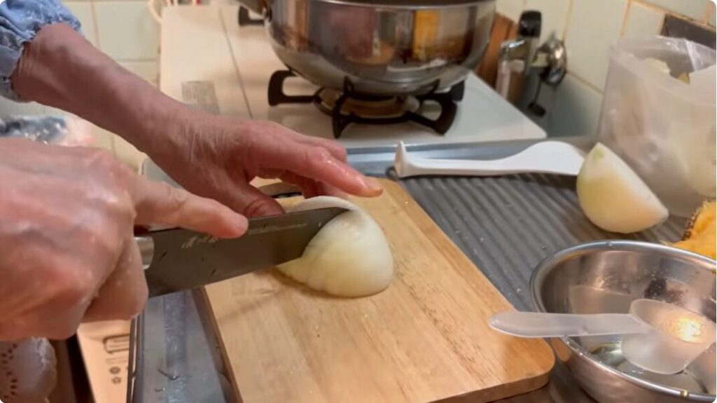 味付けのたれ作りでは、みりんを手に取り「みりん半分ぐらいにしようか」と独り言を言いながら調整します。