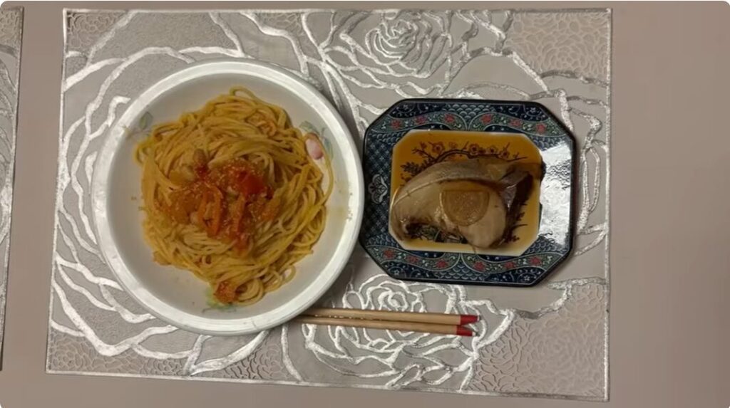 トマトとたらこのナポリタンと、魚の煮付けが完成しました。