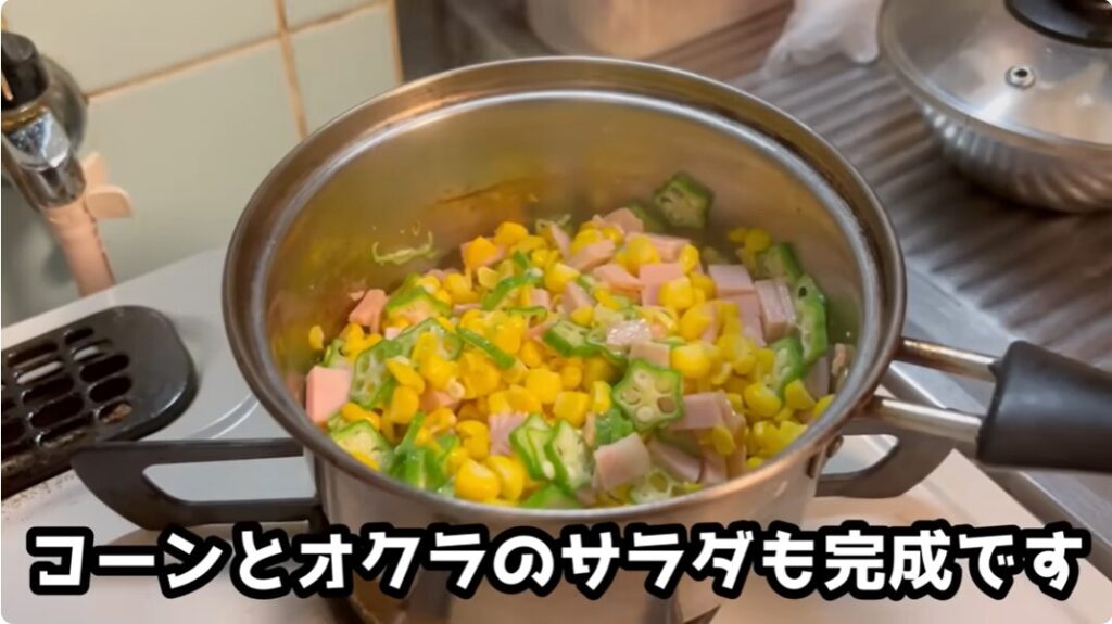オクラとコーンのサラダも、彩りよく仕上がりました。