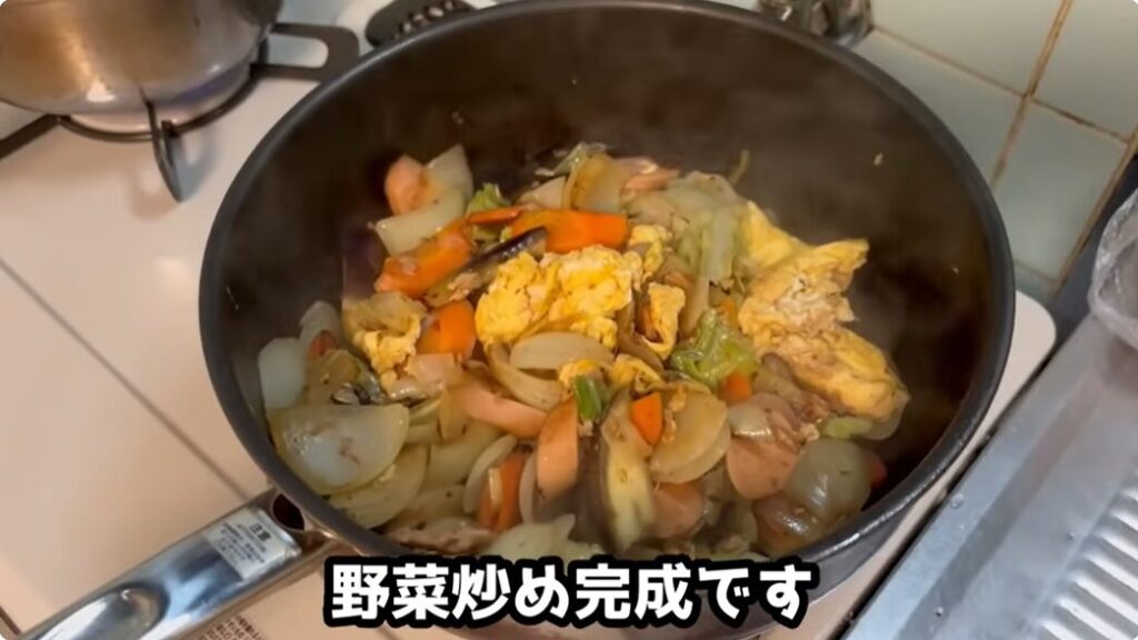 野菜と卵が混ざり合って、栄養たっぷりの野菜炒めが完成しました。