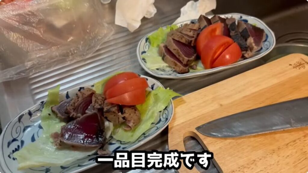 かつおのたたき、野菜炒め、ご飯、みそ汁と、バランスの良い献立が並びました。