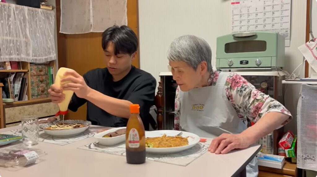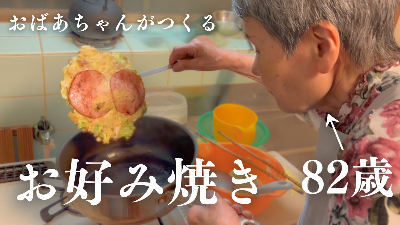 おばあちゃんはお好み焼きを作ります。